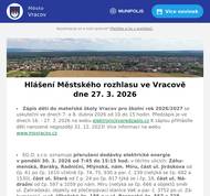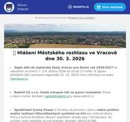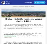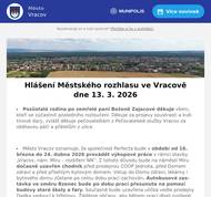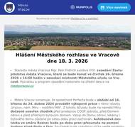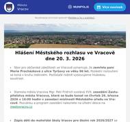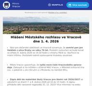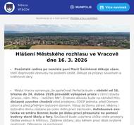 Sbor pro občanské záležitosti ve Vracově oznamuje, že zemřela paní Božena Zajacová z ulice Olšíčské ve věku 79 let. Poslední rozloučení se bude konat ve čtvrtek 12. března 2026 v 15:00 hod. ve smuteční síni ve Vracově. Pozůstalé rodině vyslovujeme hlubokou soustrast. Město Vracov oznamuje, že připravuje vydání nového čísla Vracovského zpravodaje. Své příspěvky zasílejte na e-mail kultura@mestovracov.cz. Uzávěrka příspěvků je 15. 3. 2026. Prosíme o dodržení termínu. MěÚ Vracov - účtárna oznamuje, že vybírá poplatky za domovní odpad 600 Kč za osobu a za psa 250Kč za rok 2026. Poplatek za psa pro držitele starší 65 let je 200 Kč. Poplatky můžete uhradit převodním příkazem na účet číslo 19-1427671/0100 jako variabilní symbol uveďte číslo domu a do zprávy pro příjemce napište jmenovitě, za koho poplatek platíte. Dále můžete poplatky uhradit hotově nebo kartou v účtárně v úředních hodinách. Oba poplatky jsou splatné do 30. 9. 2026. Sbor pro občanské záležitosti ve Vracově zve rodiče s dětmi na vítání občánků do života, které se bude konat v sobotu 28. 3. 2026. Rodiče, kteří mají zájem, aby bylo jejich dítě přivítáno mezi občany města Vracova, se mohou nahlásit v kanceláři účtárny MěÚ Vracov, tel. 511 147 306, pokladna@mestovracov.cz Veřejně prospěšné služby Vracov přijmou na dohodu o provedení práce plavčíka na městské koupaliště ve Vracově pro letošní sezónu – od poloviny června do konce srpna 2026. Školení v průběhu června zajistíme. Požadujeme plnoletost, spolehlivost a dobrý zdravotní stav. Bližší informace v kanceláři Veřejně prospěšných služeb ve Vracově, Vypálená 622 nebo na tel.: 739 095 091, 518 628 412. Společnost Sunny Power s 16-letou zkušeností v oboru nabízí profesionální realizaci fotovoltaických systémů na klíč pro rodinné domy, firmy a bytová družstva. Novým doplňkem služeb jsou i klimatizace. Vy určujte, kolik zaplatíte za své energie. Kontakt: 604 618 098. Firma Dveře Pochylý Vás zve do své vzorkovny dveří a zárubní v areálu Kasáren ve Bzenci na novou kolekci dveří pro rok 2026 od firmy Erkado. Nabízí dveře interiérové, posuvné, skládací, vchodové do bytu, vchodové do domu a také obklad a renovace kovových zárubní. To vše za velmi příznivé ceny. Nově nabízí také masivní vchodové dveře, které vyrábí na míru za cenu od 7.500 Kč. Více na pochyly.cz Školka, sadařství a zahradnictví DOMOV STROMŮ Moravské Lieskové nabízí dlouhověké a odolné ovocné stromy přímo od pěstitele, staré a krajové odrůdy i novější rezistentní odrůdy, drobné ovoce a netradiční ovocné druhy, okrasné a medonosné stromy, trvalky a kvalitní nářadí. S výběrem odrůd i s pěstováním vám odborně poradí v prodejně v Moravském Lieskovém, otevřeno je od pondělí do pátku od 9 do 16 hodin a v sobotu od 8 do 12 hodin. Nabídku a více informací najdete na: domovstromu.cz nebo na tel.: +421 911 910 140. Paní Eva Vaňková z Vacenovic bude ve čtvrtek 12. 3. 2026 od 9:00 do 11:00 hod. na parkovišti naproti radnice prodávat kvalitní německou a ekologickou drogerii. Nabízí prací gely 6l za 199Kč, aviváže, čistící prostředky, šampóny, krémy, parfémy, dárkové balíčky, toaletní papír, hřbitovní svíčky a další zboží za výhodné ceny. Firma JUKKA bude v pondělí 16. března 2026 od 15:15 do 16:00 hodin prodávat na parkovišti naproti radnice stromky k jarní výsadbě. Jabloně, hrušně, meruňky, nektarinky, broskvoně, švestky, švestkomeruňky, ryngle, durancie, třešně, višně, třešňovišně, kaki, mandloně, oskeruše, jedlé kaštany, olivy, vrby, moruše, lísky, angrešty, rybízy, josty, maliny, malinoostružiny, ostružiny, malinojahody, jahody, rakytník, stolní vinnou révu, borůvky, brusinky, klikvu, kiwi, aronie, magnolie, rododendrony, azalky, motýlí keře, čilimníky, šeříky, fíkovníky, pustoryl,