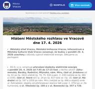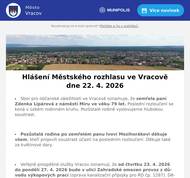 Sbor pro občanské záležitosti ve Vracově oznamuje, že zemřela paní Zdenka Lipárová z náměstí Míru ve věku 79 let. Poslední rozloučení se koná v úzkém rodinném kruhu. Pozůstalé rodině vyslovujeme hlubokou soustrast. Pozůstalá rodina po zemřelém panu Ivovi Mezihorákovi děkuje všem, kteří projevili soustrast účastí na posledním rozloučení. Děkuje také za květinové dary. Veřejně prospěšné služby Vracov oznamují, že od čtvrtku 23. 4. 2026 do pondělí 27. 4. 2026 bude v ulici Zahradské omezen provoz z důvodu výkopových prací (oprava kanalizační přípojky pro RD čp. 1287). Děkujeme za pochopení. EG.D, s.r.o. oznamuje přerušení dodávky elektrické energie ve čtvrtek 30. 4. 2026 od 7:45 do 10:30 hod. v těchto ulicích: Hlinická, Zahradská, část ul. Stará od čp. 745 po čp. 1420, část ul. Bzenecká od čp. 328 a 100 po čp. 1068 a 1060 - týká se i čp. 265, v ul. J. Husa čp. 266 a 533, v ul. Cihelná čp. 290, 632 a 1809. EG.D, s.r.o. oznamuje přerušení dodávky elektrické energie ve čtvrtek 30. 4. 2026 od 11:30 do 14:15 hod. v těchto ulicích: Sokolská, část ul. Komenského od čp. 688 a 950 po čp. 1050 a 981, v ul. Jiráskova čp. 682 a 1530, v ul. Vlkošská čp. 1652 a 1653 a v ul. Průmyslová čp. 1762. Radmil CZ s.r.o. hledá schopné lidi na pozici instalatér. Praxe v oboru nutná. Kontakt: radmil@radmil.cz a www.radmil.cz Společnost Sunny Power s 16-letou zkušeností v oboru nabízí profesionální realizaci fotovoltaických systémů na klíč pro rodinné domy, firmy a bytová družstva. Novým doplňkem služeb jsou i klimatizace. Vy určujte, kolik zaplatíte za své energie. Kontakt: 604 618 098. Oseva, a. s., pracoviště Vlkoš, přijme na hlavní pracovní poměr strojníka pro úpravu plodin. Jedná se o jednosměnný, v sezoně dvousměnný provoz. Požadavky: zodpovědnost, spolehlivost a manuální zručnost. Bližší informace na tel. 777 264 600 nebo zašlete životopis na e-mail: prace@oseva.eu Bezpečnostní služba S.E. Security Consulting, s.r.o. přijme zaměstnance na hlavní pracovní poměr na pozici: pracovníka/pracovnici ostrahy objektu v městě Hodonín. Nástup možný ihned. Práce je vhodná i pro osoby pobírající invalidní důchod. Více informací na tel. 518 321 987, 735 703 747. Strojírenská firma BÜSCH Armaturen Vracov přijme brigádníka na výpomoc do skladu na dobu 2 měsíců. Ovládání vysokozdvižného vozíku nutností, práce vhodná i pro seniora. Nástup možný ihned. Zájemci hlaste se na tel. čísle: 734 632 728 Pan Král z Dubňan bude v pátek 24. 4. 2026 od 8:00 do 10:00 hodin na parkovišti naproti radnice prodávat přísady salátu, kedluben a gigant kedluben za 5 Kč/ks, celer za 8Kč/ks, zelí, sazenice jahod 20Kč/ks a balkonové květiny 50Kč/ks. Klub seniorů města Vracova pořádá ve čtvrtek 30. 4. 2026 zájezd na jarní výstavu Floria Kroměříž. Odjezd autobusu je v 9:00 od nádraží a v 9:10 od pekárny. Cena zájezdu je pro členy klubu 100 Kč a pro ostatní 150 Kč. Vstupné si hradí každý sám. Zájemci přihlaste se a také prosím ihned zaplaťte u pana Marčíka, nám. Míru 193. Po přihlášení je možno vhodit peníze do schránky. Základní umělecká škola Vracov Vás zve na Absolventský koncert ve čtvrtek 23. 4. 2026 v 18:00 hod. v koncertním sále ZUŠ Vracov. Městský kulturní klub Vracov Vás zve do kina. V pátek 24. 4. 2026 promítáme rodinnou animovanou komedii SpongeBob: Pirátské dobrodružství.Začátek promítání je v 18:00 hodin. Občerstvení zajištěno. Cena vstupného je 120Kč. SDH Vracov a Město Vracov Vás srdečně zvou na Oslavu 145. výročí založení SDH Vracov v sobotu 25. 4. 2026 od 16:00 u hasičské zbrojnice ve Vypálené ulici. V 16:00 bude slavnostní žehnání nového zásahového vozidla. Těšit se můžete na prohlídku hasičské zbrojnice, ukázky požární techniky, předvedení nového zásahového vozidla a ukázky požárních zásahových vozidel z okolních s