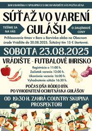 Dobrý deň, Bar u Barvínka v spolupráci s obcou Vrádište Vás srdečne pozývajú v sobotu 23.8.2025 na futbalové ihrisko, kde sa uskutoční Súťaž vo varení gulášu. Počas celého dňa si môžete vyskúšať jazdu na Ródeo býk, ochutnať grilované špeciality no najmä ochutnať guláše od vyše 20 súťažných tímov. O zábavu sa postara hudobná country skupina Prospektori. O 17.30 hod Vás pozývame na futbalový zápas medzi TJ Družstevník Vrádište a TJ Družstevník Bukovec Všetci ste srdečne vítaní