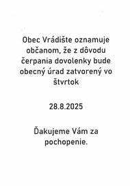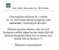 Dobrý deň, Obec Vrádište oznamuje občanom, že v sobotu t.j. 1.11.2025 z dôvodu štátneho sviatku bude obecné kompostovisko zatvorené. Ďakujeme za pochopenie