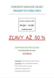 Vážení občania, v stredu 10. septembra príde do našej obce očný optik. Predaj dioptrických okuliarov a odborné meranie zraku sa bude konať v stredu od 10:30 do 11:30 v kultúrnom dome vo Svadobke. V ponuke sú kvalitné dioptrické okuliare na čítanie a do diaľky už od 40 eur a tiež slnečné okuliare s najvyššou ochranou proti slnečnému žiareniu. Okuliare netreba objednávať, dajú sa kúpiť hneď na mieste so zľavou až do 50%.