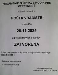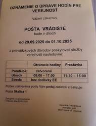 Dobrý deň, oznamujeme občanom dňa 1.10.2025 t.j. v stredu od 8.00 do 18.00 hod bude prerušená distribúcia elektrickej energie na väčšine súpisných čísiel. Podrobný prehľad nájdete v prílohe. Bude zatvorený Obecný úrad Vrádište, Coop Jednota Vrádište aj Pošta Vrádište.