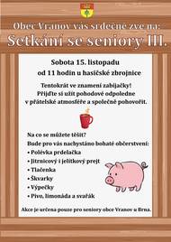 Obec Vranov Vás srdečně zve na setkání se seniory III., které se koná v sobotu 15. listopadu 2025 od 11 hodin u hasičské zbrojnice. Tentokrát se můžete těšit na zabíjačku a bohaté občerstvení v přátelské atmosféře.