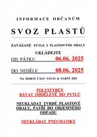 Tento týden bude ve Vrčeni probíhat svoz plastů. Zavázané pytle s plastovými obaly ukládejte od pátku 5.9. do neděle 7.5. 2025 na horní část návsi ke zdi. Pneumatiky a tvrdé plastové obaly neukládat, nebudou odvezeny.