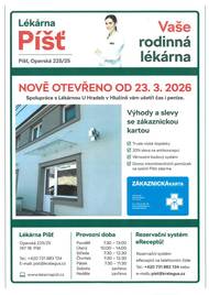 Po celkové rekonstrukci je od 23.3.2026 nově otevřená lékárna v Píšti. Velkou výhodou lékárny je přímá vazba na lékárnu U Hradeb v Hlučíně a tím rozšíření sortimentu i služeb. Lékárna nabízí výhody a slevy se zákaznickou kartou. Velkým bonusem je rezervační systém e-receptů.