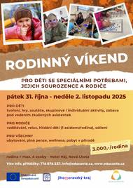 Milí rodiče, pečující a přátelé naší organizace, s radostí bychom Vás chtěli pozvat na Rodinný víkend, který pořádáme na konci října pro děti se speciálními potřebami, jejich sourozence a rodiče. Čeká Vás víkend plný pohody, podpory a společně stráveného času v příjemném prostředí. Program je připraven tak, aby si každý člen rodiny přišel na své. Cílem víkendu je nejen odpočinek, ale také posílení vztahů a sdílení zkušeností mezi rodinami, které čelí podobným výzvám.