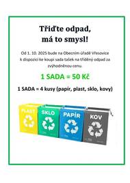 Na obecním úřadě se od 1. 10. 2025 prodávají tašky na tříděný odpad. 50 Kč za sadu. 1 sada = 4 tašky (papír, plasty, sklo a kovy)