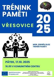 Obec Vřesovice a MAS Kyjovské Slovácko pro Vás připravilo "TRÉNINK PAMĚTI" 17. 10. 2025 od 16:00 hod. v Komunitním centru ve Vřesovicích.