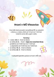 Srdečně zveme děti, které ještě nenavštěvují MŠ a jejich rodiče na hraní, které se uskuteční v březnu a dubnu 2026. Akce proběhnou v úterý 24. března, ve středu 8., 15. a 22. dubna od 10:00 do 11:30 hodin.