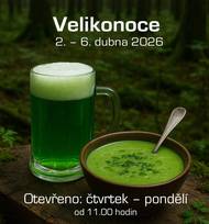 Hospůdka v Les parku otevřena 2. - 6. 4. 2026 od 11:00 hodin. Velikonoční pondělí otevřeno již od 10:00 hodin. Zelené pivo a speciality včetně jehněčího a jarních zelených polévek každý den.