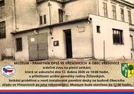 Muzeum Vřesovice vás zve na návrat pamětní desky Žižlavských na budovu OÚ, který se koná 12. dubna 2026 ve 14 hodin. Muzeum bude otevřeno od 14:00 do 17:00 hodin. V rámci programu se ve 14:30 uskuteční tematická přednáška o výsadku Zinc, která přiblíží důležité historické události.