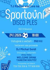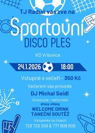 TJ Raduň zve na Sportovní disco ples, který se uskuteční 24. 1. 2026 v KD Vršovice.