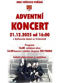 Adventní koncert ve Vršovicích Obec Vršovice srdečně zve všechny občany na tradiční Adventní koncert, který se uskuteční 21. prosince 2025 od 16:00 v Kulturním domě ve Vršovicích. V úvodu se můžete těšit na krátké zahájení, po kterém vystoupí vokální skupina THE PEARLS. Jejich adventně laděný program slibuje příjemnou atmosféru a hudební zážitek, který zpříjemní předvánoční čas. Pro návštěvníky bude připraveno také bohaté občerstvení. Těšíme se na společné setkání a na krásný adventní podvečer strávený u hudby a v příjemné společnosti.
