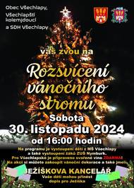 Vážení spoluobčané, rádi bychom vás pozvali na rozsvícení vánočního stromu, které se uskuteční v sobotu 30. 11. 2024 od 16:00 před budovou OÚ Všechlapy. Jako tradičně se můžete těšit na vystoupení dětí z MŠ Všechlapy a ze ZUŠ Nymburk. Nebude chybět ani svařák zdarma. Zakoupit si můžete vánoční dekorace a jmelí. Nově si u stánku se svařákem můžete zakoupit hrneček (60 Kč) nebo kelímek (40 Kč) s vánoční tématikou.