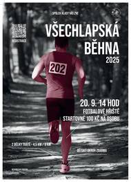 Spolek Klasy za podpory SDH Všechlapy a TJ Sokol Všechlapy Vás srdečně zve na 1. ročník běžečkého závodu Všechlapská běhna. 🏃♂️ Všechlapská běhna – 1. ročník! 🏃♀️ 📅 20. 9. 2025 | od 14:00 📍 Fotbalové hřiště Všechlapy Pro dospělé trasy 4,5 km nebo 9 km, pro děti opičí dráha zdarma 🐒 Startovné dospělí: 100 Kč (v ceně pití + tyčinka) ✅ Registrace online (QR kód na plakátě / odkaz: REGISTRAČNÍ FORMULÁŘ) nebo na místě. Přijď si zaběhnout, pobavit se a užít si skvělou atmosféru! ✨