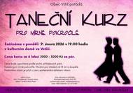 Vstiš pořádá taneční kurz pro začátečníky a mírně pokročilé, který začne v pondělí 6. října 2025 v 19:00 hodin v kulturním domě. Kurz je určen pro mládež od 15 let a dospělé, přičemž účast je možná pouze v párech a doporučujeme společenské oblečení.