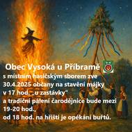 Zveme všechny občany na tradiční pálení čarodějnic, které se uskuteční 30. dubna 2025. Akce začne ve 17 hodin na zastávce, následovat bude opékání buřtů od 18 hodin na hřišti a samotné pálení čarodějnic proběhne mezi 19. a 20. hodinou.