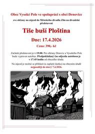 Obec Vysoké Pole, ve spolupráci s obcí Drnovice, zve všechny občany na zájezd do Městského divadla Zlín. Na programu je divadelní představení 'Tiše buší Ploština', které se koná 17. dubna 2026. Cena za účast činí 390 Kč a autobus pro občany obou obcí odjíždí v 17:45 od obecního úřadu.
