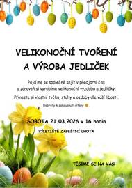 Vážené dámy a děti, pojďme se sejít v předjarní čas a zároveň si vyrobíme společně velikonoční výzdobu a jedličky. Přineste si vlastní tyčku, stuhy a ozdoby dle vaší libosti. Dobroty k zakousnutí vítány. Sobota 21.03.2026 od 16 hodin na výletišti. Těšíme se na Vás!