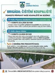 🧹 Čištění koupaliště – letní sezóna volá! letošní napouštění koupaliště bude kvůli nedostatku vody trochu oříšek, tak jsme naplánovali brigádu na dvě fáze: Sobota 25. 4. (9:00): Vyčistíme brouzdaliště a hned ho napustíme, abychom měli zásobárnu vody na hlavní čištění. Sobota 2. 5. (9:00): Hlavní akce! Čištění velkého bazénu vapkou, pletí a úklid okolí. Na tu druhou sobotu (2. 5.) bychom potřebovali každou ruku navíc. Kromě bazénu chceme stihnout i přípravu dřeva, abychom měli čím topit v klubovně a na čem později opéct prase! 🐖🔥 Odměna: Pivo, nealko a libové párečky zajištěny po oba dny. Díky moc, že nám pomůžete dát koupaliště do pucu! SDH a obecní zastupitelé Zábřezí-Řečice