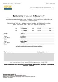 SČVK oznamují, že dne 2.8.2023 od 8:00 do 12:00 dojde v Želénkách v rámci rekonstrukce vodovodního řadu k přerušení dodávky pitné vody, platí pro č.p. 5, 4, 122, 95.