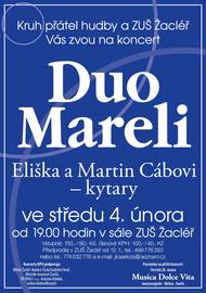 Před 1 měsícemKONCERT KYTAROVÉHO DUA MARELI - ELIŠKA A MARTIN CÁBOVIV koncertním sále žacléřské ZUŠ Žacléř vystoupí 4. února v 19 h duo manželů Cábových, které odehrálo řadu koncertů po celé České republice a zúčastnilo se mistrovských kurzů u renomovaných pedagogů. Specializuje se na kombinaci tradičního kytarového repertoáru s vlastními aranžemi klavírních skladeb, čímž rozšiřuje zvukovou paletu kytary a zároveň obohacuje kytarový repertoár o nové a neobvyklé úpravy skladeb. Předprodej vstupenek: Kruh přátel hudby, Jiří Jirásek tel: 774 032 776, Hudební 308, Žacléř