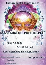 Zveme vás na Maškarní rej pro dospělé, který se uskuteční 7. února 2026 od 19:00. Přijďte si užít večer plný tance, zábavy a setkání s přáteli. Nezapomeňte přijít v originálním kostýmu! Pro účastníky je připravena bohatá tombola.