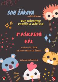 SDH Žákava a Obec Žákava Vás zvou na Dětský maškarní bál v sobotu 21.2.2026 od 14:00 ma sále hospody U Špejcharu.
