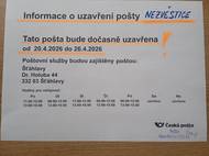 Pošta NEZVESTICE bude dočasně uzavřena od 20. dubna 2026 do 26. dubna 2026.