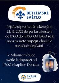 Před 25 dnyBetlémské světlo - 22.12.2025 17:00Betlémské světlo bude možné si vyzvednout u kaple sv. Donáta ode dneška 17:00 do Štědrého dne do 18:00.