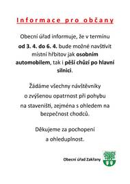 Před 19 dny1.4.2026 - HLÁŠENÍ OBECNÍHO ROZHLASU1. Obecní úřad Zítra 2. 4. bude od 10:00 do 13:00 hod. uzavřena cesta k bytovkám (úsek most – křižovatka) z důvodu ořezu dřevin. V tomto čase nebude možný průjezd v daném úseku. Děkujeme za pochopení. 2. Obecní úřad Obecní úřad informuje, že v termínu od 3. 4. do 6. 4. bude možné navštívit místní hřbitov jak osobním automobilem, tak i pěší chůzí po hlavní silnici. 3. Obecní úřad Obecní úřad informuje, že ve dnech 24. 4. a 25. 4. bude v areálu ekodvora přistaven kontejner na stavební suť. 4. Obecní knihovna Knihovna Zakřany má nový výpůjční fond i pro děti a mládež. 5. Obecní úřad Upozorňujeme občany, že poplatky na rok 2026 měly být uhrazeny nejpozději do 31. března. Žádáme ty, kteří tak dosud neučinili, aby poplatky uhradili v co nejkratším možném termínu. Vybírají se poplatky na rok 2026. Opady 800 Kč/os. Pes 100 Kč/kus Stočné 1800 Kč/os. Kabelová televize 1500 Kč Poplatky můžete uhradit na účet č. 4124641/0100, VS číslo domu nebo v hotovosti v kanceláři OÚ. 6. Obecní úřad Podepisují se aktualizované smlouvy na hrobová místa a vybírají se poplatky za pronájem. Jednohrob 500 Kč Dvojhrob 1000 Kč Trojhrob 1500 Kč Čtyřhrob 2000 Kč Kolumbárium 500 Kč Poplatky můžete uhradit na účet č. 4124641/0100, VS číslo hrobu nebo v hotovosti v kanceláři OÚ. 7. Základní a Mateřská škola Zakřany Základní a Mateřská škola Zakřany vás zve na Velikonoční stezku od 1. do 7. dubna. Čeká vás 20 stanovišť s úkoly. Start je u autobusové zastávky směrem na Zbýšov naproti kostelu, cíl u „Vajíčkovníku“ před obecním úřadem, kde bude odměna. Psací potřeby s sebou. 8. Sokolovna Zakřany Sokolovna Zakřany zve na zelený čtvrtek 2.4. v 18:00 hod. K tanci a poslechu hraje kapela Pro Vás, tombola, vstupné dobrovolné. 9. SDH Zakřany V sobotu 11.4. proběhne sběr železa od 13:00 hod. 10. Spolek Zakřanské hody Spolek Zakřanské hody ve spolupráci s Vinařstvím Bábkovi Vás srdečně zvou na Večer v rytmu vína 18.4. v 18:00 hod. v sále OÚ. Degustace prémiových vín, registrace na tel. čísle 777 096 495. Po skončení degustace k tanci a poslechu hraje kapela PRO VÁS, občerstvení zajištěno. 11. Výkupčí drahých kovů Výkupčí drahých kovů nabízí v naší obci služby a to výkup zlatých zubů, korunek, které zdarma očistí od zbytků zubů. Dále veškeré zlaté prstýnky, náušnice, řetízky, hodinky a jiné. Nabízí také možnost výkupu stříbra a to jak ve formě šperkové, technické nebo v podobě mincí a příborů. Možnost také odkupu Platiny, Palladia nebo palargenu. Výkup se uskuteční ve čtvrtek 2.4. před obecním úřadem od 11:10 - 11:30 hod.