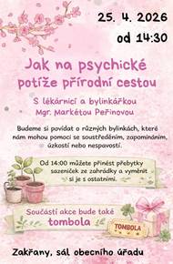 Před 5 dny15.4.2026 - HLÁŠENÍ OBECNÍHO ROZHLASU1. Obecní úřad Od 20. do 24. dubna proběhne plánované přerušení dodávky plynu z důvodu stavebních prací. Odstávka se týká lokalit Bytovky, část Zálesí a domy směr Slavíkovi. Dotčení odběratelé byli o této skutečnosti informováni. Žádáme o pochopení a přizpůsobení se této situaci. Děkujeme. 2. Obecní úřad Obecní úřad informuje, že ve dnech 24. 4. a 25. 4. bude v areálu ekodvora přistaven kontejner na stavební suť. 3. Obecní úřad OÚ Zakřany Vás srdečně zve na tradiční pálení čarodějnic, které se uskuteční ve čtvrtek 30. dubna od 17 hodin na hřišťátku u ČOV. Těšit se můžete na pivo i limo, soutěže pro děti, zapálení vatry a vítány jsou i čarodějnické kostýmy. Pro děti i dospělé je připravena možnost vyrobit si vlastní čarodějnici, která bude následně společně upálena. Tradičně zahraje kapela Pro vás. Program začíná v 17 hodin soutěžemi, v 19 hodin proběhne vyhlášení a v 19:30 zapálení vatry. Přijďte si užít příjemné odpoledne a večer s přáteli. 4. Obecní úřad Upozorňujeme občany, že poplatky na rok 2026 měly být uhrazeny nejpozději do 31. března. Žádáme ty, kteří tak dosud neučinili, aby poplatky uhradili v co nejkratším možném termínu. Opady 800 Kč/os. Pes 100 Kč/kus Stočné 1800 Kč/os. Kabelová televize 1500 Kč Poplatky můžete uhradit na účet č. 4124641/0100, VS číslo domu nebo v hotovosti v kanceláři OÚ. Splatnost byla do 31.3. 5. Obecní úřad Podepisují se aktualizované smlouvy na hrobová místa a vybírají se poplatky za pronájem. Jednohrob 500 Kč Dvojhrob 1000 Kč Trojhrob 1500 Kč Čtyřhrob 2000 Kč Kolumbárium 500 Kč Poplatky můžete uhradit na účet č. 4124641/0100, VS číslo hrobu nebo v hotovosti v kanceláři OÚ. Splatnost byla do 31.3. 6. Spolek Zakřanské hody Spolek Zakřanské hody ve spolupráci s Vinařstvím Bábkovi Vás srdečně zvou na Večer v rytmu vína 18.4. v 18:00 hod. v sále OÚ. Degustace prémiových vín, registrace na tel. čísle 777 096 495. Po skončení degustace k tanci a poslechu hraje kapela PRO VÁS, občerstvení zajištěno. 7. TJ Sokol Zakřany Tělovýchovná jednota Sokol Zakřany zve na zápas proti Lažánkám, v neděli, 19. 4., v 16.00 hodin. Občerstvení zajištěno. 8. Obecní knihovna Srdečně vás zveme na slavnostní křest knihy Hádanky do vany, na který vás zvou Olda Hlaváček a Agáta Bicanová. Akce se uskuteční v pátek 24. dubna od 16:30 hod. v knihovně Zakřany. Můžete se těšit na příjemné odpoledne, špetku umění a dobré nálady. Určeno pro děti i dospělé. 9. Zahrádkáři Zakřan Zahrádkáři zvou na přednášku „Jak na psychické potíže přírodní cestou“, která se uskutečnív pátek 25. dubna od 14:30 hod. v sále obecního úřadu v Zakřanech. Přednášet bude lékárnice a bylinkářka Mgr. Markéta Peřinová. Dozvíte se více o bylinkách, které mohou pomoci se soustředěním, zapomínáním, úzkostí nebo nespavostí. Od 14 hodin si také můžete přinést přebytky sazeniček ze zahrádky a vyměnit si je s ostatními. Součástí akce bude i tombola. Srdečně zvou pořadatelé. 10. Dům zdraví Zastávka Dům zdraví Zastávka oznamuje: MUDr.Valeš nebude ordinovat 16.4. a 17.4., 16.4. bude přítomna pouze sestra od 7.00 - 11.00 hod.,zástup MUDr.Pokorná Zbraslav. V pátek 17.4. zástup MUDr.Kubešová od 7.00 - 12.00 hod. Neurologická ambulance nebude ordinovat 16.4. MUDr.Kubešová nebude ordinovat 20.4. - 27.4., zástup MUDr.Valeš, PO, ÚT, ČT a PÁ 7.00 - 11.00, ST 13.00 - 16.00. Denzitometrie bude mimo provoz 20.4. - 27.4. 11. MUDr. Stránská MUDr. Stránská oznamuje: dne 17.4. neordinuje z důvodu řádné dovolené, v akutních případech zástup středisko Říčany.