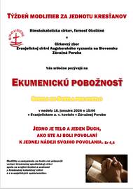 Rímskokatolícka cirkev, farnosť Okoličné - filiálka Závažná Poruba a Cirkevný zbor Evanjelickej cirkvi Augsburského vyznania na Slovensku Závažná Poruba Vás srdečne pozývajú na Ekumenickú pobožnosť, ktorá bude pri príležitosti otvorenia Týždňa modlitieb za jednotu kresťanov.