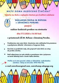 Deň otvorených dverí pre všetkých. Počas stretnutia bude predstavená škola, jej fungovanie a rodičia budú mať možnosť prezrieť si jej priestory. Súčasťou programu budú aj praktické rady, ako pripraviť dieťa na nástup do prvého ročníka, a priestor na zodpovedanie otázok.