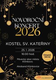 Zveme do Klimkovic na Novoroční koncert 2026, který se uskuteční v neděli 25. ledna od 16:00 v Kostele sv. Kateřiny. Vystoupí Pěvecký sbor města Klimkovic a Akoband Klimkovice.