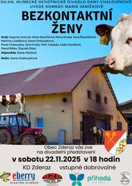 Vážení, dne 22.11.2025 si vás dovolujeme pozvat do KD Zderaz na divadelní představení Bezkontaktní ženy 💁🏽♀️ v podání hlineckých ochotníků v seskupení DU:HA. 🌈 Představení začíná v 18 hodin a vstupné je dobrovolné. Těšíme se na příjemný kulturní večer. 🎭