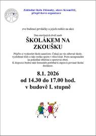 Základní škola Zdounky pořádá pro budoucí prvňáčky a jejich rodiče den otevřených dveří aneb Školákem na zkoušku v termínu 8.1.2026 od 14.30 do 17.00 hod. v budově prvního stupně. Dáme dětem šanci vyzkoušet si školu nanečisto formou zábavných úkolů. Děti potřebují jen sportovní obuv, sportovní oblečení a chuť vyzkoušet si něco nového. Těší se na vás učitelky prvního stupně.