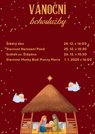 Vánoce ve farnosti Zdounky - kostel bude otevřen na Štědrý den od 14.00 do 16.00 hod. - pro betlémské světlo si přijďte do kostela již od 09.00 hod. Vánoční bohoslužby: Štědrý den 24.12. v 16.00 hod. Slavnost Narození Páně 25.12. v 10.30 hod. Svátek sv. Štěpána 26.12. v 10.30 hod. Slavnost Matky Boží Panny Marie 01.01.2026 v 16.00 hod.