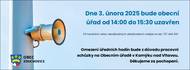Ve středu 12. února 2025 bude obecní úřad uzavřen v době od 12:00 do 17:00 h. Obecní úřad je možné navštívit dopoledne nebo po telefonické dohodě se starostou obce i mimo úřední hodiny, tel. 737 444 519.