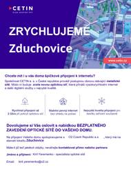 Obec má momentálně jedinečnou možnost zajistit zavedení optické přípojky až k Vám domů, a to zcela zdarma, díky spolupráci se společností CETIN a.s. Během druhé poloviny května Vás navštíví s žádostí o podpis dokumentu schválení zavedení přípojky zástupci společnosti O2 Czech Republik a.s.
