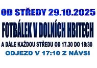 Tělovýchovná jednota zve všechny zájemce na fotbálek v Dolních Hbitech. Hraje se od 29.10.2025 každou středu od 17:30. Odjezd z návsi cca v 17:10. Nutná sálová obuv sebou.