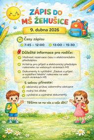 Základní škola J. V. Sticha-Punta v Žehušicích vyhlašuje zápis pro školní rok 2026/2027. Ten se uskuteční v pátek 16. ledna 2026. Podrobné informace včetně online přihlášky budou k dispozici na webu školy v průběhu října.