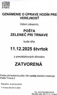 Oznamujeme občanom, že dňa 11.12.2025, t.j. vo štvrtok, bude pošta Zeleneč zatvorená.