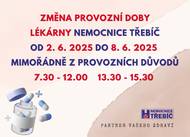 Vážení pacienti a návštěvníci, dovolujeme si vás informovat, že od listopadu 2025 dochází k prodloužení otevírací doby Lékárny Nemocnice Třebíč. Nová otevírací doba: Pondělí–čtvrtek: 7:00–16:30 Pátek: 7:00–16:00 Sobota, neděle a svátky: 8:00–12:20, 12:50–17:00 Vybrané svátky, kdy jsou velké obchody uzavřeny (7 dní v roce): 8:00–12:20, 12:50–20:00