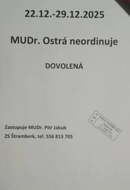 V době od 22.12. do 29.12.2025 MUDr. Ostrá NEORDINUJE. Zástup: MUDr. Jakub Pítr, Štramberk, tel: 556 813 705.
