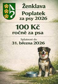 Poplatek ze psů pro rok 2026 je 100,- Kč za jednoho psa a za druhého a každého dalšího psa téhož držitele je poplatek 100,- Kč. Splatnost poplatku je 31.3.2026 – v hotovosti na pokladně Obecního úřadu v úředních dnech nebo převodem na účet u ČS a.s. č. ú. 4758311329/0800. Jako variabilní symbol uveďte číslo popisné, specifický symbol 1341. Na obecním úřadě je také možnost platit kartou. Bližší informace k místním poplatkům najdete v Obecně závazné vyhlášce obce Ženklava č.1/2019 o místním poplatku ze psů.