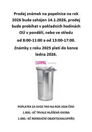 Prodej známek na popelnice na rok 2026 bude zahájen 14.1.2026, prodej bude probíhat v pokladních hodinách obecního úřadu v pondělí, nebo ve středu od 8:00-11:00 a od 13:00-17:00. Známky z roku 2025 platí do konce ledna 2026.