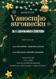 Vážení občané, zveme Vás na rozsvěcení vánočního stromečku. Přijďte za námi v sobotu 30. 11.2024 v 17 hodin na žeretickou náves. Od 17 hodin Vám děti zahrají představení Živý betlém a přibližně v 17:30 rozsvítíme vánoční stromeček, přivítáme adventní čas a vyhlásíme výherce soutěže o nejhezčí vánoční ozdobu. Čekat zde na Vás bude i oblíbený čaj a výborný svařák a samozřejmě již tradiční dobrůtky od našich hospodyněk.