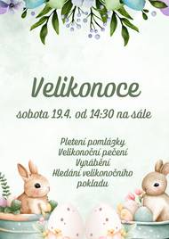Vážení občané, dovolujeme si Vás pozvat na Velikonoční dílničky na sále obecní hospody. V sobotu 19. dubna od 14:30 Upleteme pomlázky, upečeme si velikonoční dobrůtky a budeme hledat poklad! Těšíme se na Vás