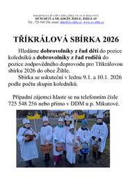DDM Raketa Žihle hledá dobrovolníky z řad dětí (koledníky) a rodičů (doprovod) pro Tříkrálovou sbírku, která se koná 9.1. a 10.1.2026 v Žihli.